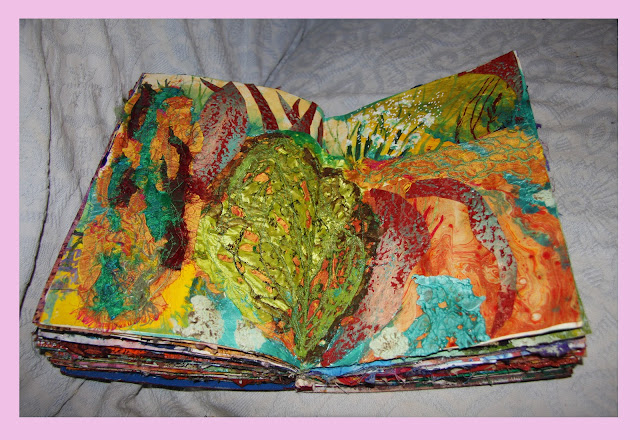 I simply layer up colours, textures and fabrics. There is no meaning to any of this, and certainly no planning. The pages just develop over time. What I am aiming for is inspiration, that I can use in my work, whether it is a painting, or one of my cushion covers.